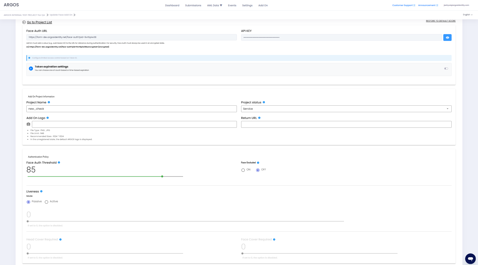 To apply a token, you must enable the token expiration condition setting option in the FaceAuth project, and it works as follows: